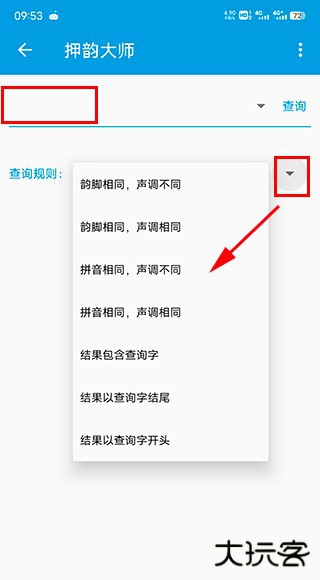 3、返回主页,点击“查询规则”下拉菜单切换韵脚分类。