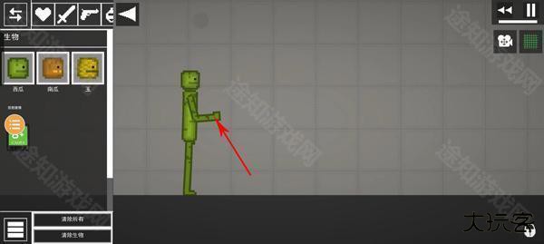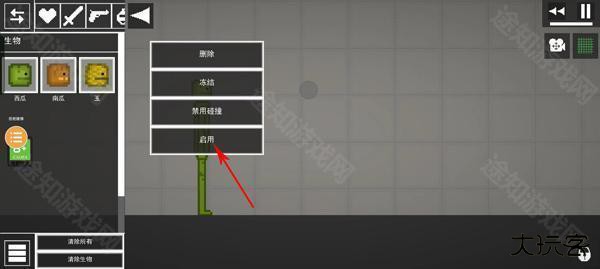 3、然后将胳膊抬起,双击西瓜角色胳膊会出现删除、冻结、静置碰撞、启用,选择冻结,胳膊就会停住;