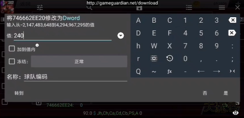 6、脚本功能界面搜索定位该球员对应的唯一数字代码,将它修改为240这个值,弹窗确认选择是。