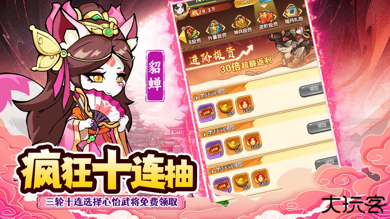 2.十连抽卡必出保底角色,概率透明公示,搭配每日免费抽卡机会,让每位玩家都能收集心仪武将。