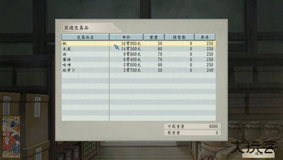 直接前往座购买交易品,尽管京之町的牛蒡打折力度很大,但不要被老板给诱惑了,牛蒡的价值非常低,即使全买也赚不了太多钱,趁着库存还充足,把所有资产都拿去买茶。