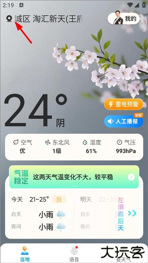 1、用户打开七彩天气预报自动定位版,进入当地主页,用户可查看当前天气、温度、小时预报、15日天气预报以及人工语音播报等,点击左上角定位刷新至最新位置;