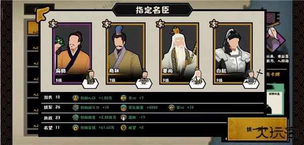 搭配的名臣是扁鹊,商鞅,姜尚,白起,商鞅可以用张仪代替,这套搭配几乎有着无可匹敌的军事能力,前期就可以获得极高的战斗力和军心加成,商鞅和白起出征胜利都可以夺取他国军心,姜尚则是夺取敌国民心,并且还有封神和奇袭两个aoe技能,和扁鹊的范围回复生命值,商鞅和姜尚的技能正好互补,使其降低民心的负面效果被抵消掉,加上扁鹊的增加人口兵甲速度加成,前期就可以快速扩张,可以说是速推必备的一套搭配。