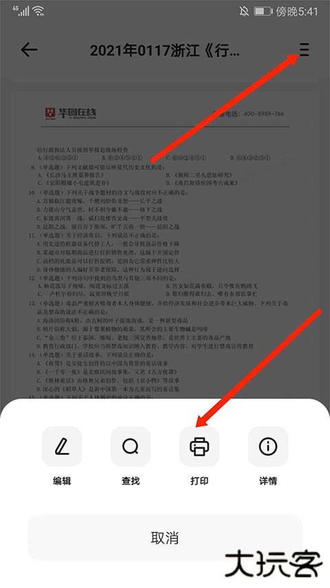 4、进入卷子预览界面,选择右上角“三横”选项,最后选择“打印”选项即可打印卷子。