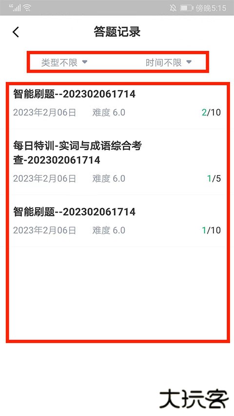 2、进入答题记录界面,可以设置答题类型和答题时间,选择需要查看的题目内容,