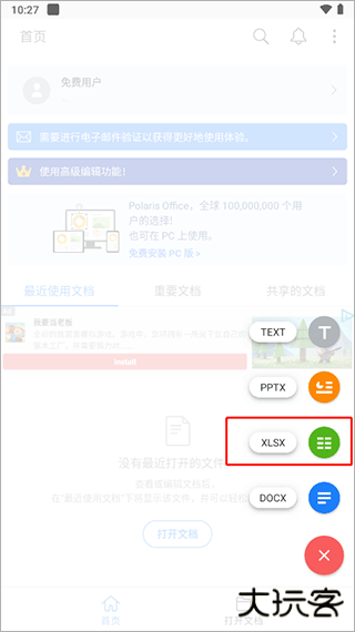 2、登陆后点击【+】图标,选择你要使用的功能,例如【XLSX】