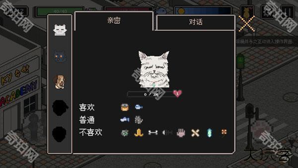 - 翻找垃圾堆、纸箱、罐头获取食物与道具,拿到道具后点击即可食用,将特定道具送给NPC可增加好感度,交给门口的猫咪可升级猫窝,获得更多体力健康与对话次数。
