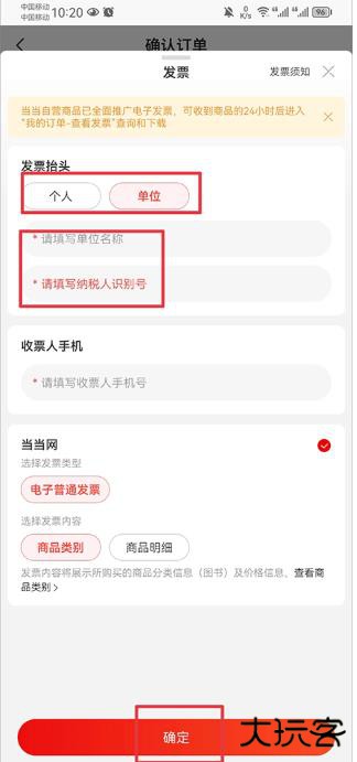 5、最后选择个人或单位发票抬头,单位抬头需要填写单位名称和纳税人识别号,选择完成后点击确定,最后确认订单信息后支付订单即可。