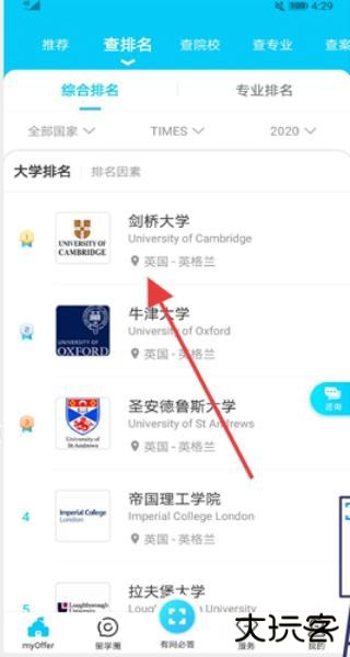 2、院校排名页面,可查看综合排名和专业排名,展示2020年TIMES榜单中剑桥大学等世界知名大学排名情况。