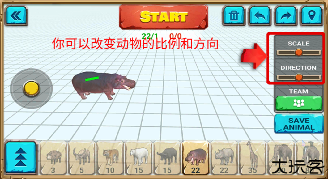 8、右边的SCALE和DIRECION可以改变动物的比例大小和行动方向