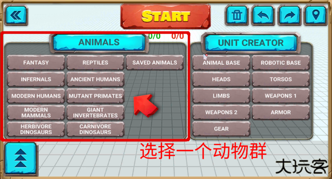 1、打开动物战争模拟器国际服最新版游戏,有四种游戏类型,关卡、沙盒模式、挑战赛和工坊