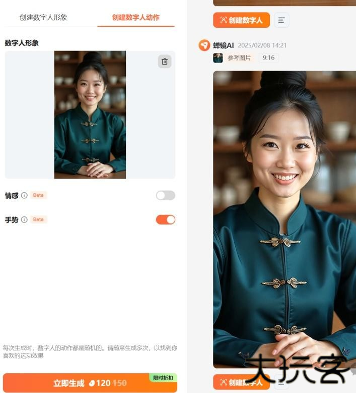 3、然后创建数字人动作,情感和手势等,点击[立即生成];