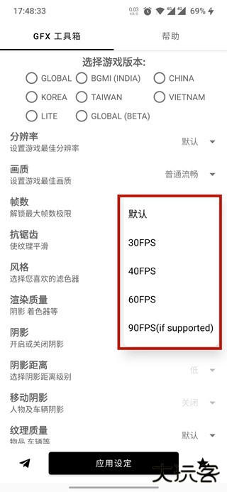 4、点击帧数,推荐选择60FPS不仅可以提升画质