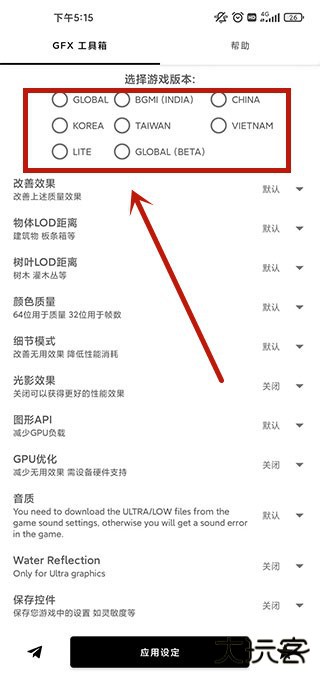 1、打卡gfx工具箱pubg120帧app,选择游戏版本(国服、国际服等8个版本)