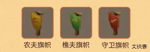 农夫旗帜、樵夫旗帜、守卫旗帜:旗帜的周边区域成为对应职业伙伴的工作地点。