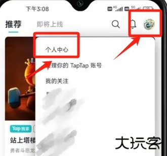 1、打开TapTap应用并登录你的账号,然后点击右上角头像,在点击个人中心