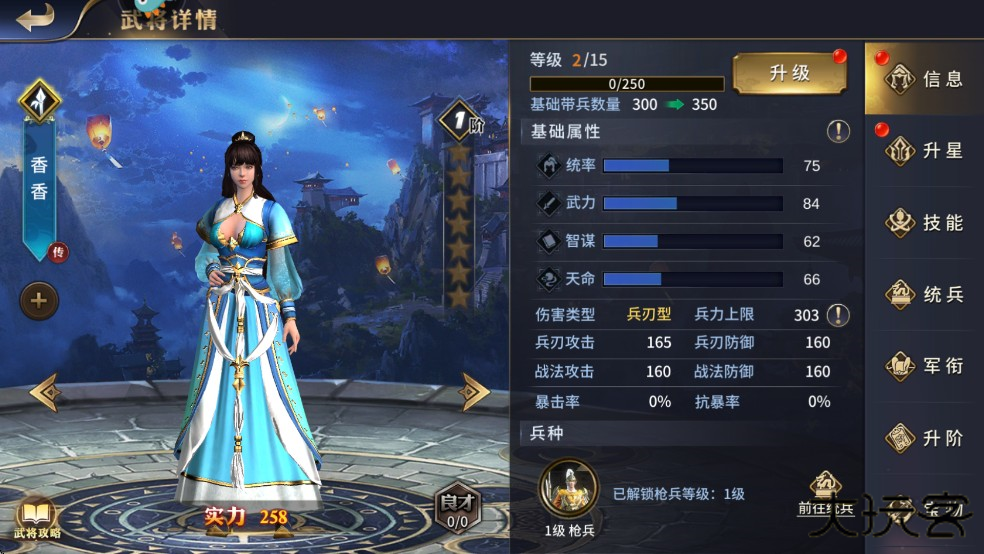 1、香香是兵刃输出型枪兵武将,武力为核心属性。其身世背景虽为没落世家之女,但已具备实战能力。