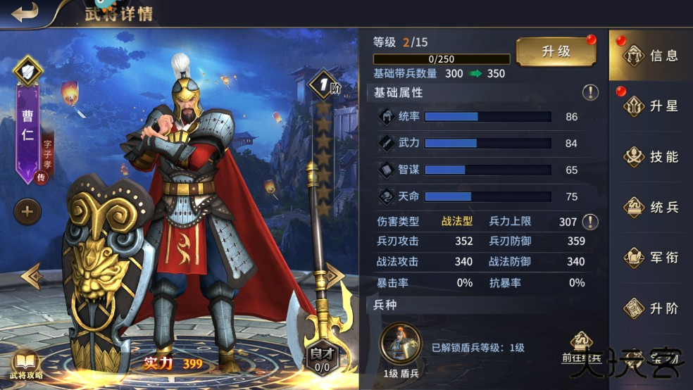 1、曹仁定位为战法输出型盾兵武将,核心属性是统率。其技能擅长应对高额兵刃输出的敌方阵容。