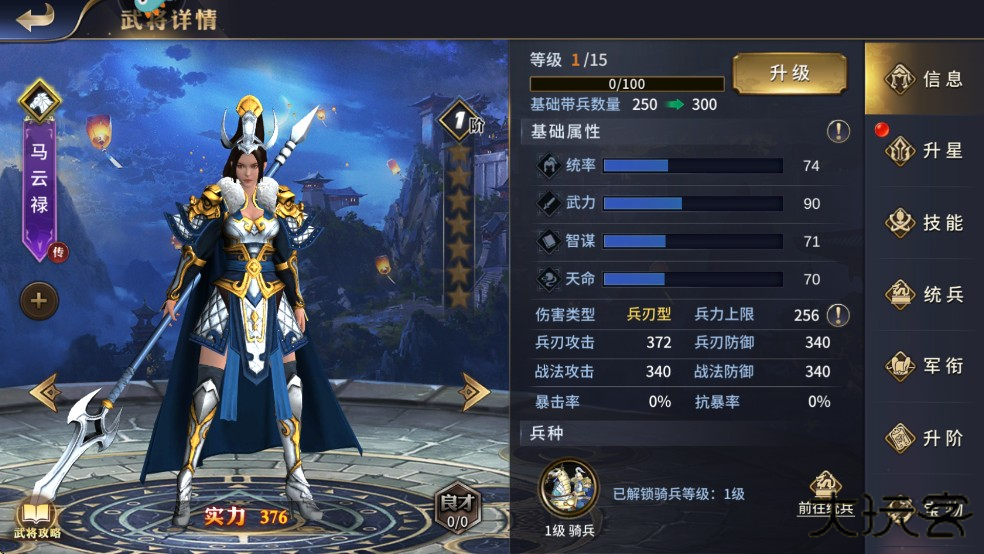 1、马云禄为兵刃输出型骑兵武将,以武力为主属性。其技能设计专门克制盾兵,意在利用骑兵冲锋特性快速击杀敌方前排盾兵,建立兵力优势。