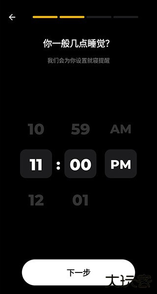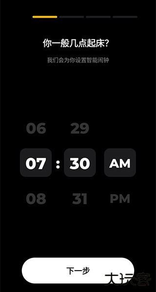 1.下载并安装睡眠追踪app安卓版,完成后打开软件来到设置引导界面,先设定日常起床时间后点击下方的下一步选项
