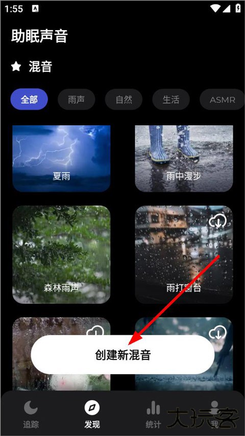 2.在发现页面有各种助眠声音选择,点击创建新混音选项