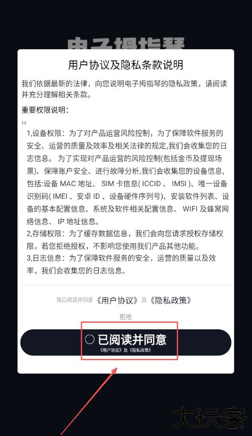 1、打开电子拇指琴调音器app后,先找到软件协议相关选项,点击同意协议才能继续使用软件功能。
