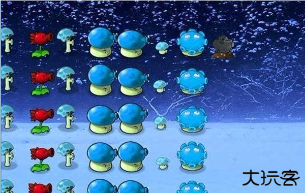 注:如果这一关出现气球僵尸的话,把吸钱蘑菇上面的那个种上菖蒲就可以了。如果出现蹦极僵尸或篮球车的话,在第2行第2格、第2行第5格、第5行第2格、第5行第5格的花铲掉,种上那种会张开的萝卜。