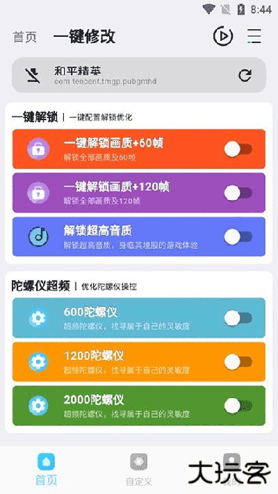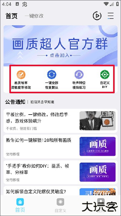 1、打开画质超人最新版,在首页选择你需要的功能点击开启,如画质帧率灵敏度修改、一键全部恢复默认、自定义DIY等;