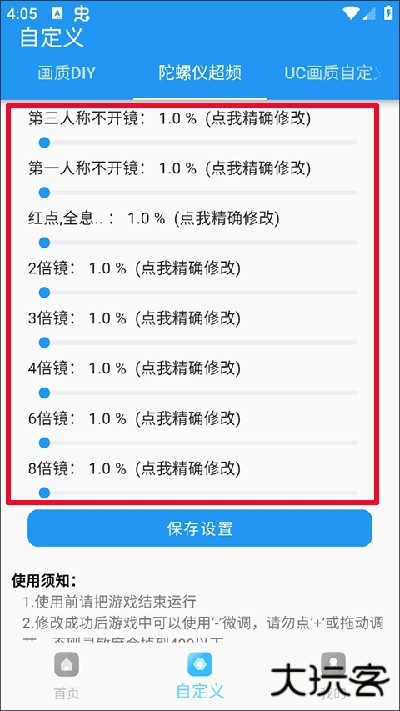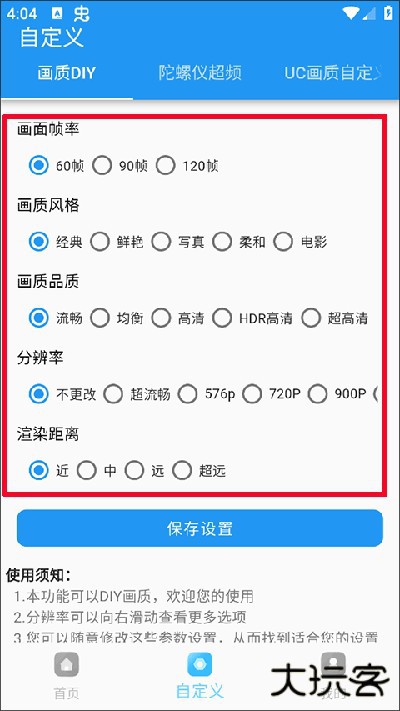 2、点击【自定义】开启自定义选项设置,包括画质DIY、陀螺仪超频、UC画质自定义;