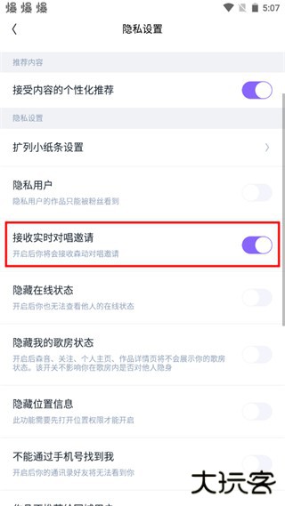 4、选择页面下方【接收实时对唱邀请】选项点击右边按钮开启。
