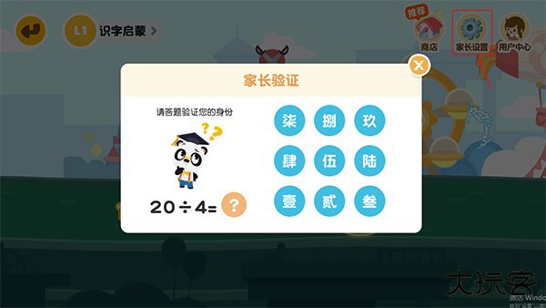 1、首先我们打开软件后,在首页点击右上角的“家长设置”,进到页面需要先答题验证一下您的身份。