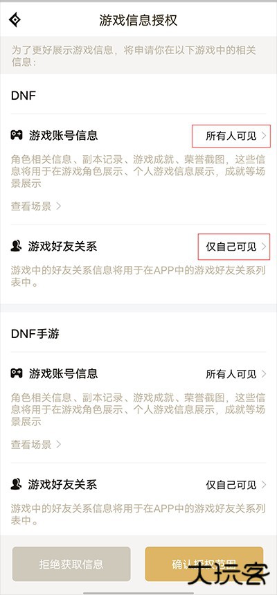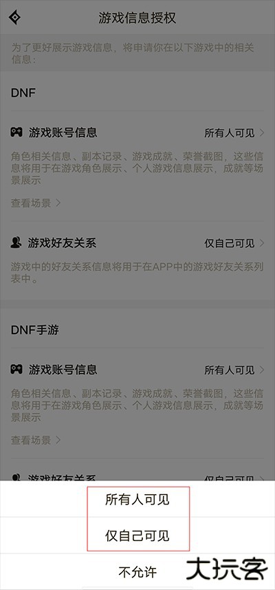 3、进入游戏信息授权界面后,点击游戏账号信息右侧的所有人可见选项。