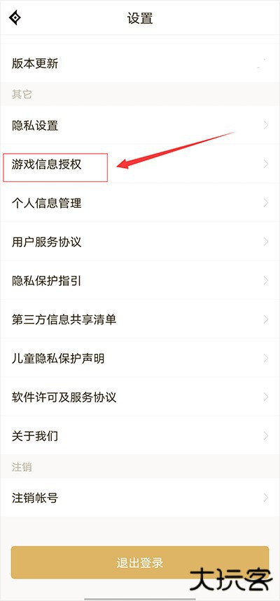 2、在设置界面中下拉找到并点击游戏信息授权选项。
