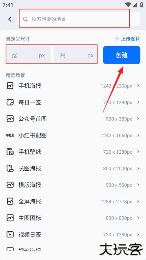第五步:若是想要自定义模板,可以在首页中点击创建设计,然后自定义尺寸后点击创建即可设计自己喜欢模板