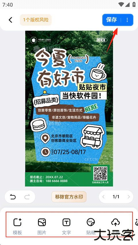 3、选择一个喜欢的模板,使用下方提供的编辑工具开始创作,完成后点击右上角的保存;