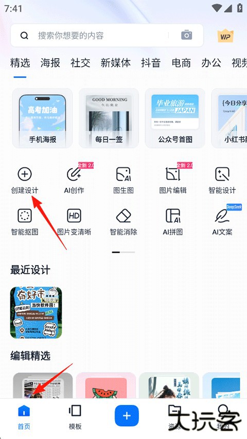 1、打开创客贴AI画匠app,点击首页-创建设计功能;