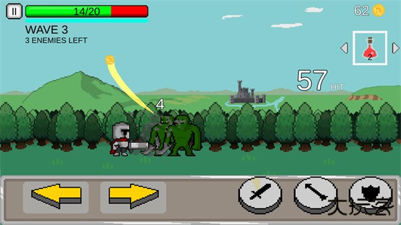 2、进入关卡后点击左侧的按钮控制角色移动,右侧的按钮是使用长剑、弓箭、防御。