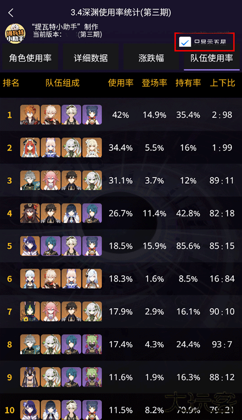 3、点击下图框出位置,还可以只看五星角色等等
