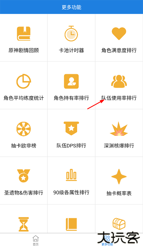 1、先在更多功能模块点击队伍使用率排行