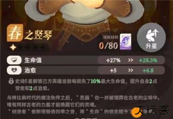 生命汲取属性实用性优于春之竖琴,金色五星效果具备一定战略意义。然而整体而言,两款竖琴灵器均非推荐培养目标。