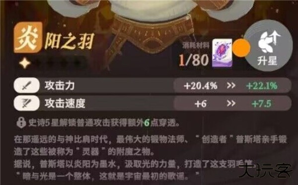 当前版本综合推荐度较高的灵器。攻击力与攻击速度属性提升效果显著,五星解锁的穿透属性使其具备广泛适用性。