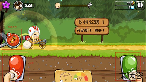 5、比赛开始进入赛道,操作区域主要分为三部分:屏幕底部左侧为刹车控制区域,右侧则为油门加速区域,屏幕左侧还可能设有推进器按钮;启动油门全速前进;