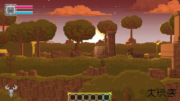 1、游戏开始点左侧山上有复活石,学习二次跳跃后蹦上去吃,点击红条左侧经验框调出物品栏,拖动2个复活石到使用栏,退出物品栏,选中复活石点击屏幕右侧透明图标使用。