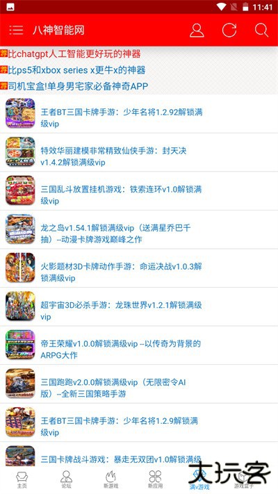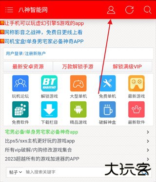 1、八神智能论坛软件首页可以看到许多不同类型资源分类,点选你自己想要了解的游戏资源部分前往。