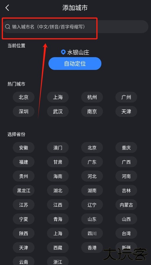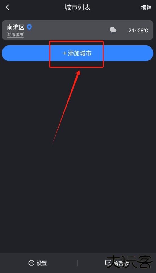 2、在弹出的菜单中选择“添加城市”,准备输入自己想关注的地点名称。
