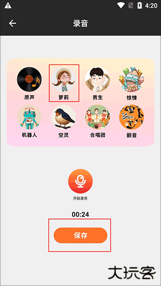 然后重头戏来了,我们点击游戏上面萝莉的声音,是不是发现我们录得声音发生了改变?确定好了后点击保存可以保存你选定的录音了。