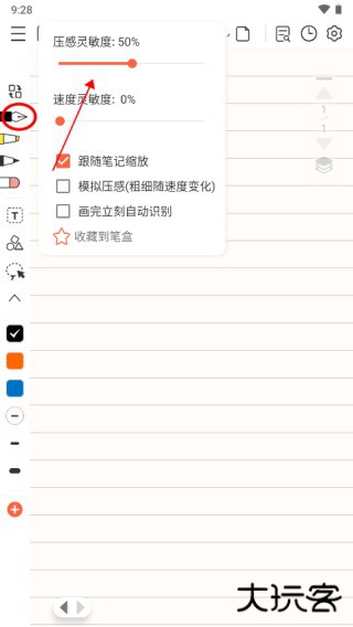 5、再点击左侧提供的笔,点击可以调整灵敏度等。