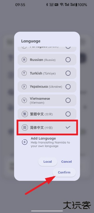 3、选择最后的“简体中文”,然后点击下方“Confirm”。