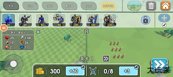 步兵是一种拿剑的士兵,他们战斗力中等,可以轻易压制前面的低级兵,可以用来当做主力步兵。