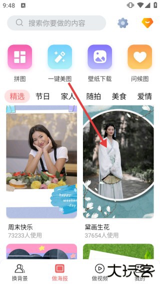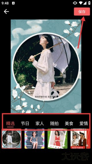 3、进入制作界面,可切换【精选】【节日】等分类选图替换,最后点击右上角【保存】完成操作。